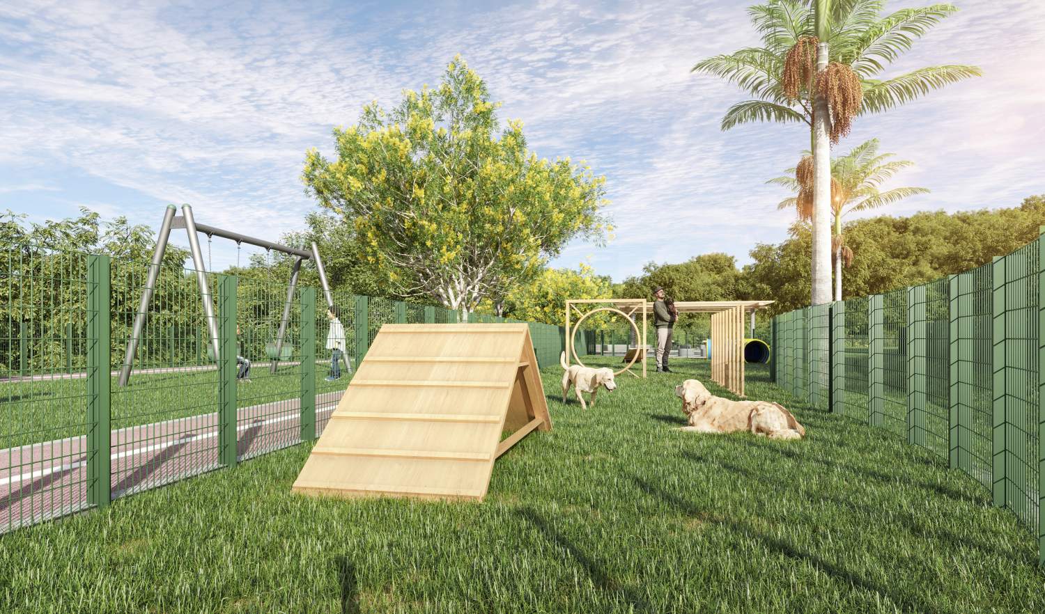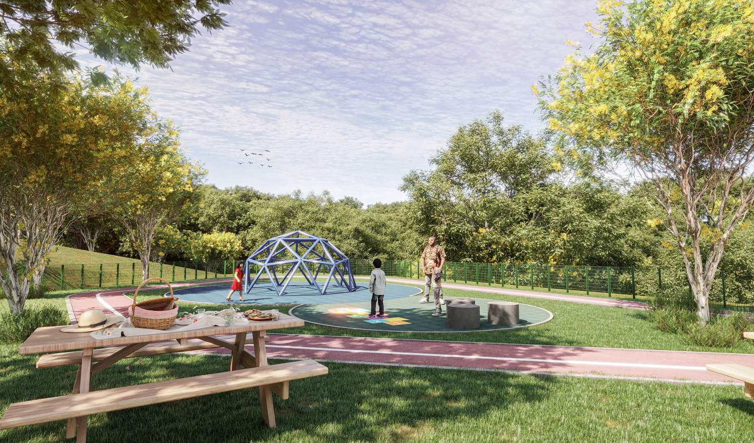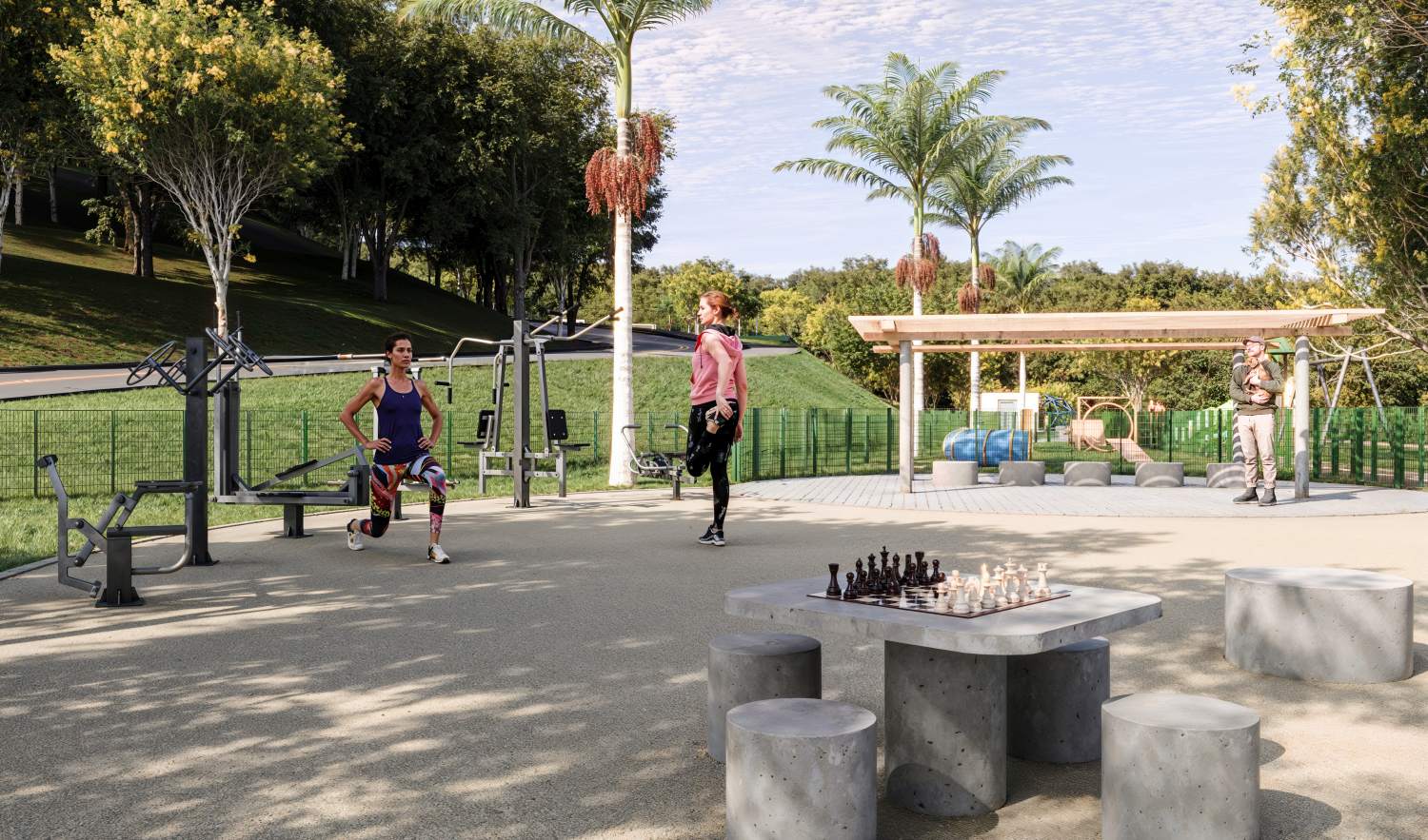 Imagine começar o dia praticando exercícios na pista de cooper cercada por natureza, ver as crianças se divertindo com segurança no playground, reunir amigos na área de piquenique ou até aproveitar um jogo saudável na quadra de basquete, futebol ou no skate park. Além disso, você conta com alameda comercial, ruas bem estruturadas, iluminação de qualidade e acesso facilitado aos principais pontos da região.